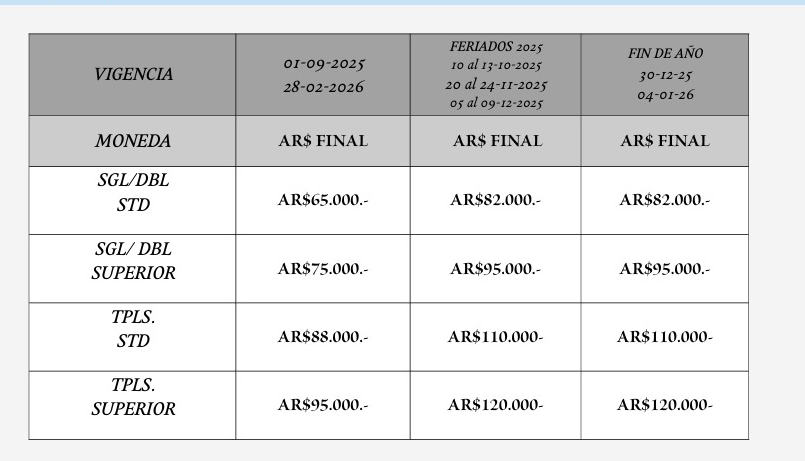 No incluye desayuno. Late Check Out hasta las 16:00 hs: 50% de la tarifa que corresponda.