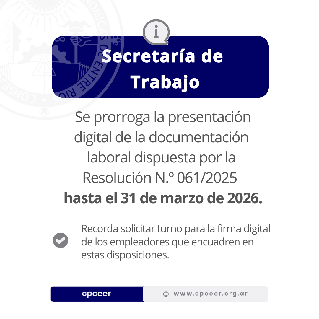 Conforme a las gestiones realizadas ante la Secretaría de Trabajo de la Provincia, mediante las cuales se solicitó la prórroga de los plazos para la presentación digital de la documentación laboral dispuesta por la Resolución N.º 061/2025 de esa Secretaria, resolvieron postergar las fechas de cumplimiento hasta el 31 de marzo de 2026.