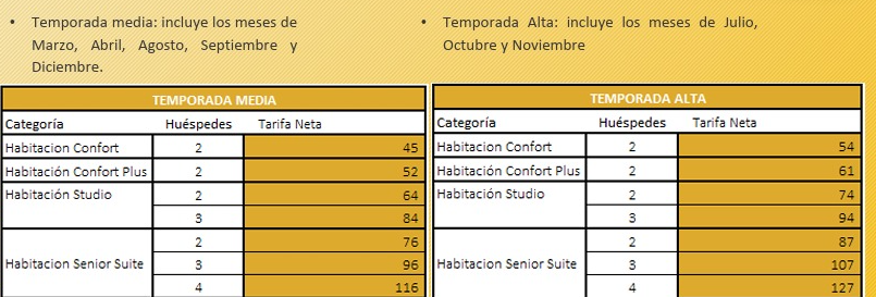 • Tarifas expresadas en Dólares Estadounidenses, por Departamento/Habitación por noche.